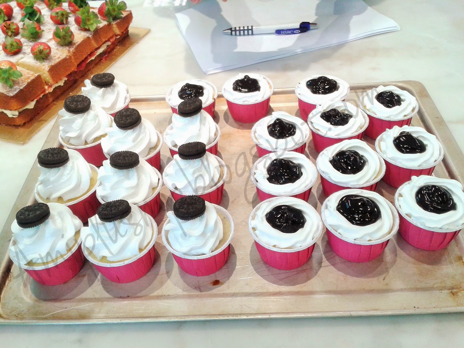 When all the recipes and baking are done, she proceeds with her decorations, using cream, mini oreos and blueberry jams.